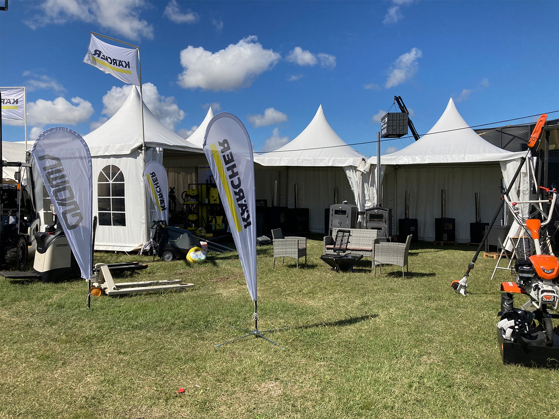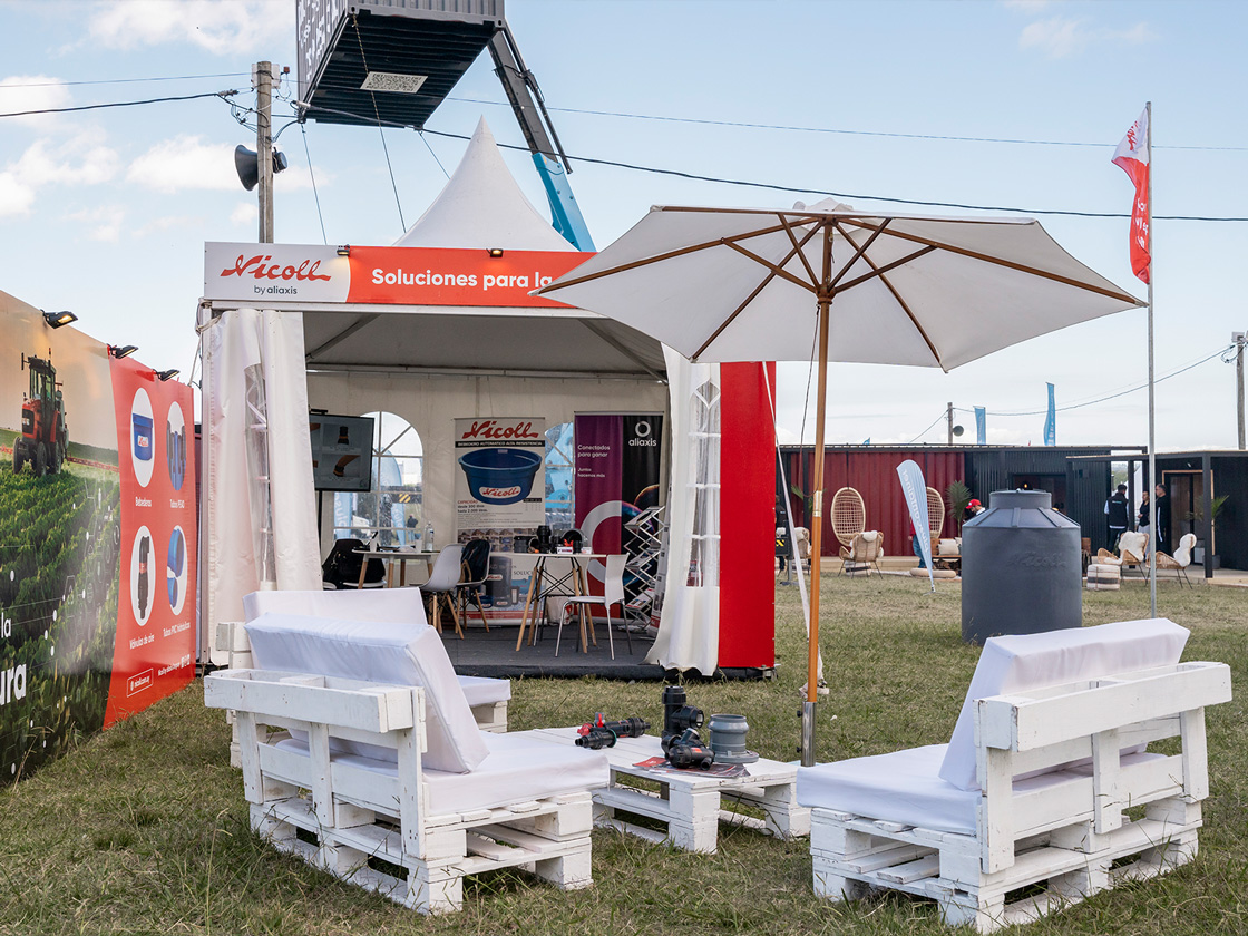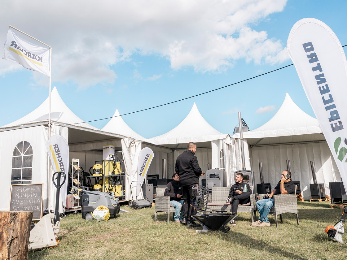 Las carpas elegidas fueron las estructurales y pagodas, permitiendo a nuestros clientes crear espacios versátiles y profesionales para exhibir sus propuestas y realizar negocios en un ambiente rural.