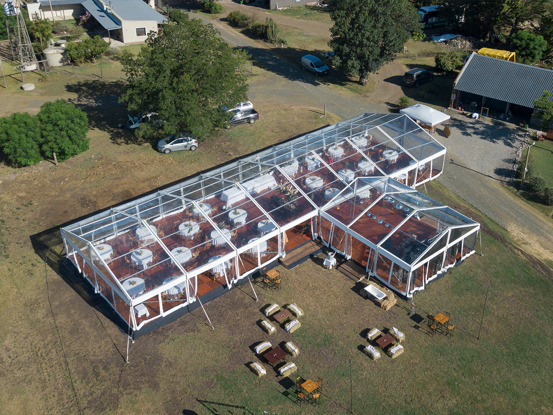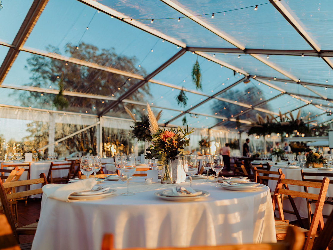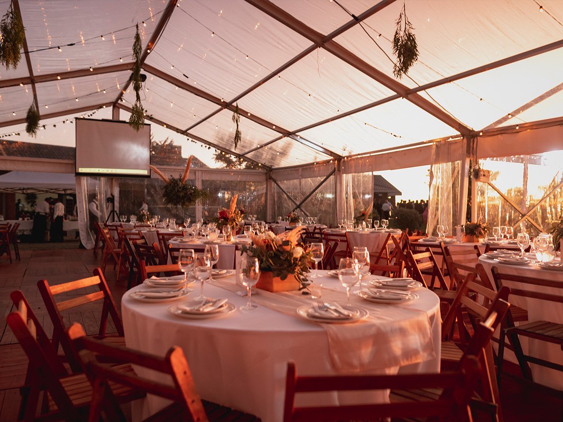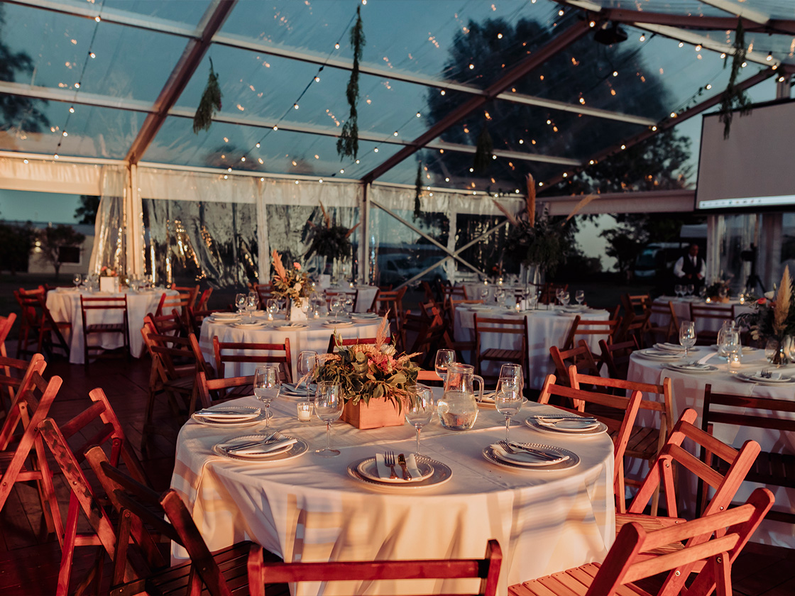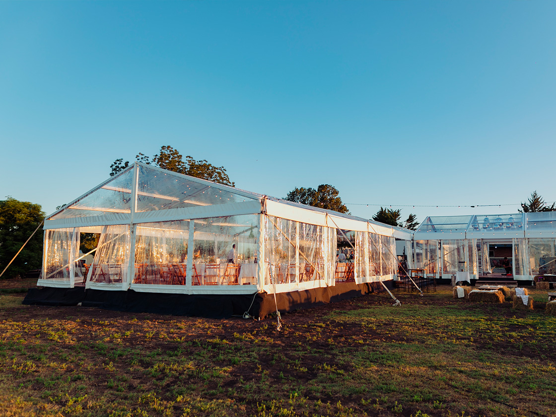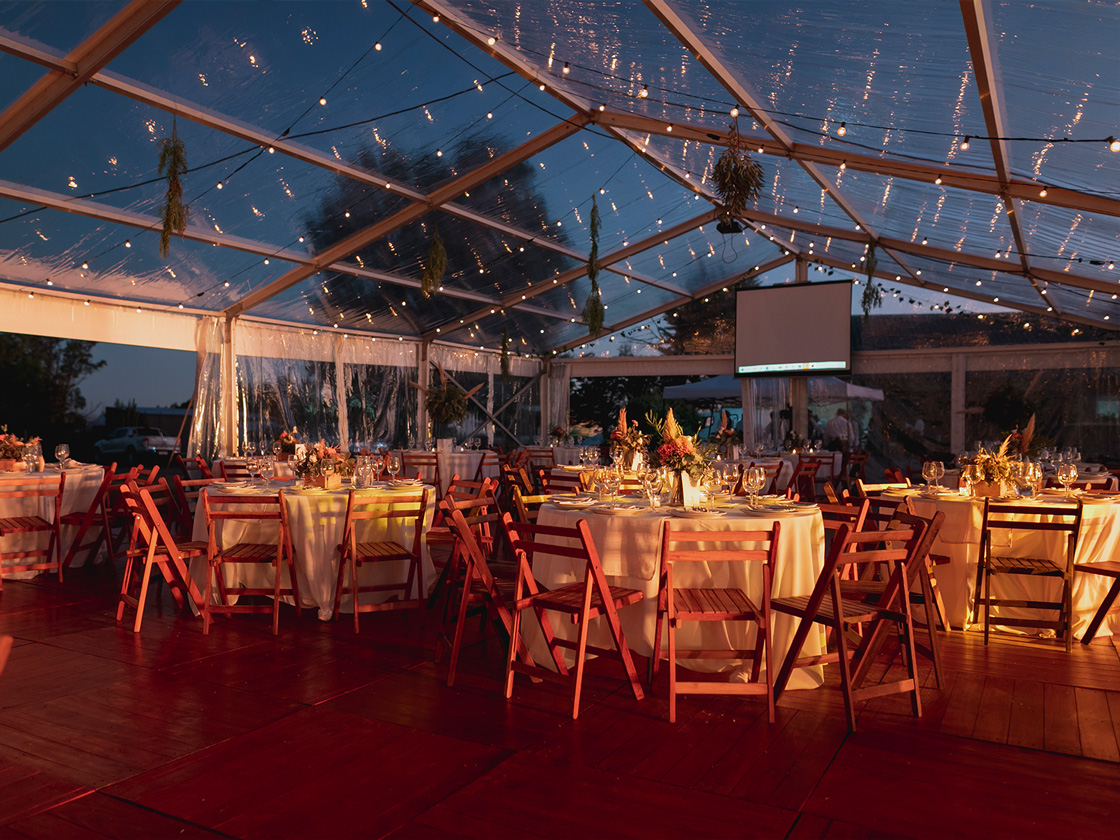 Con dos de nuestras carpas estructurales transparentes, diseñamos un espacio que reflejaba su personalidad. Un piso de madera, mesas de bar y sillas cómodas, invitaron a los invitados a disfrutar de una velada inolvidable y divertida.