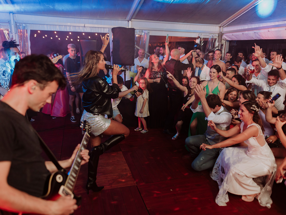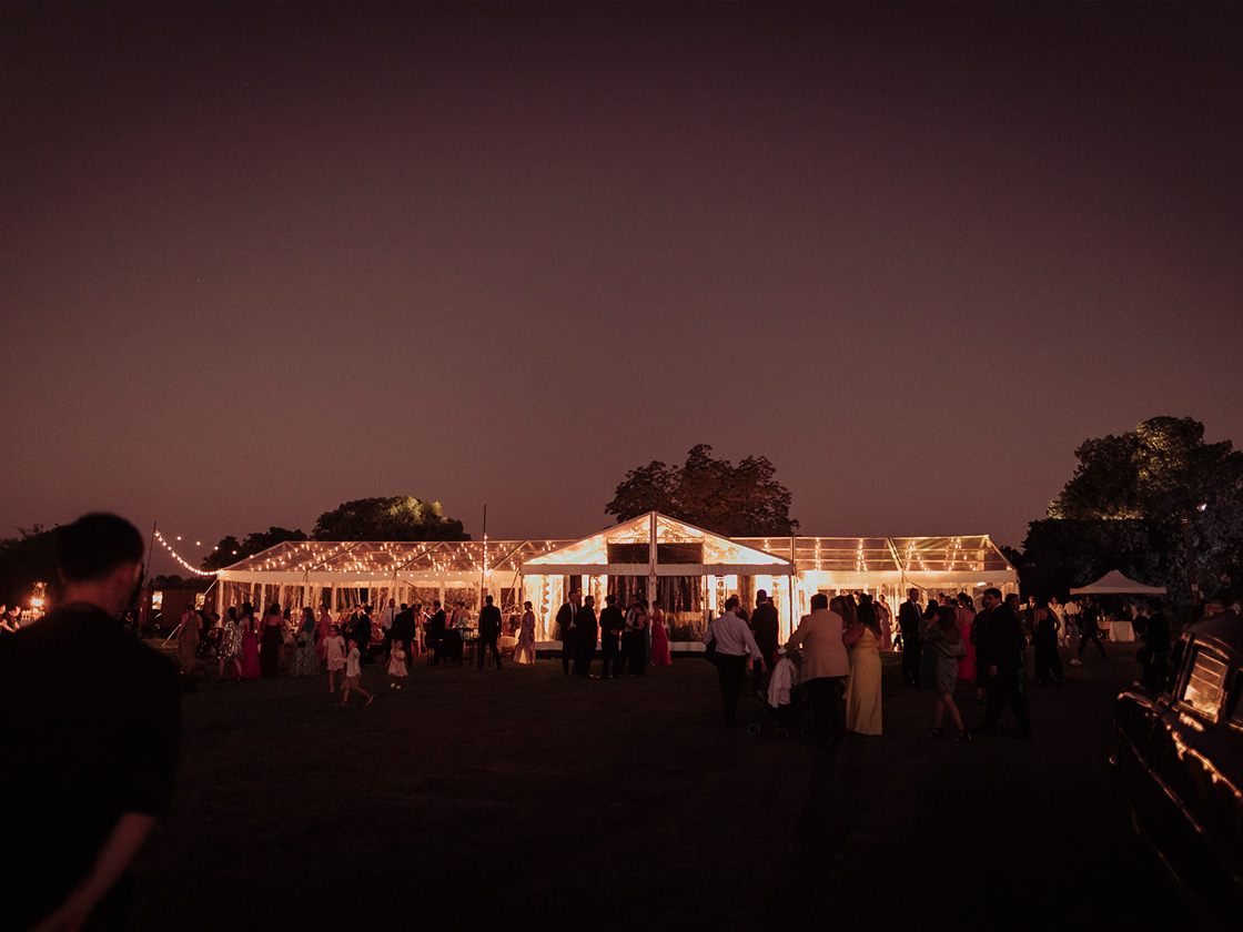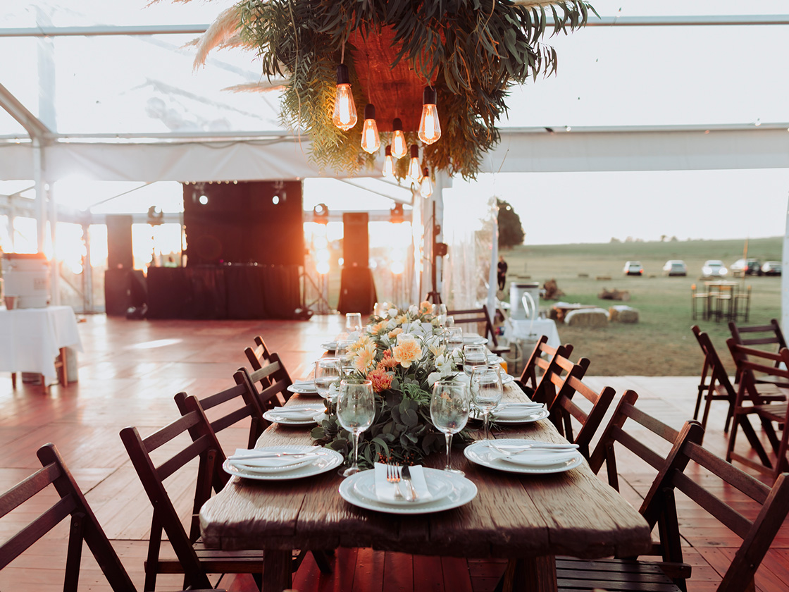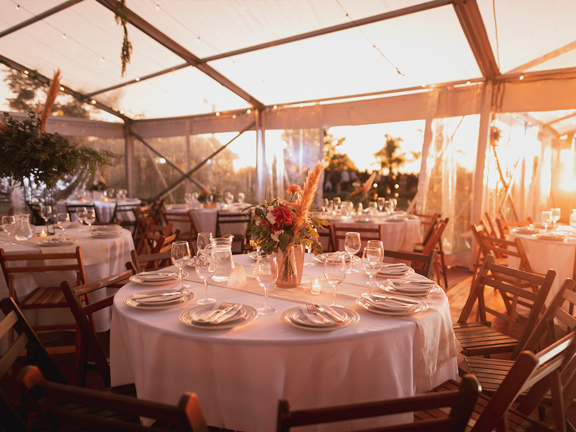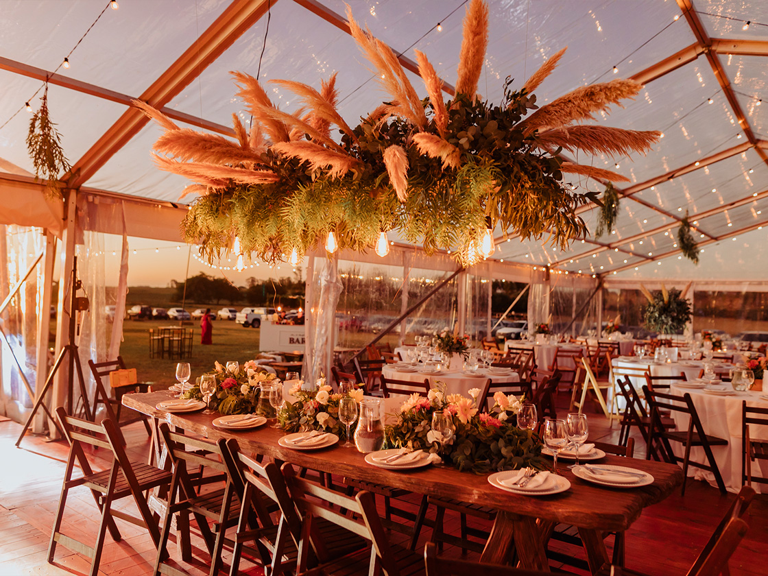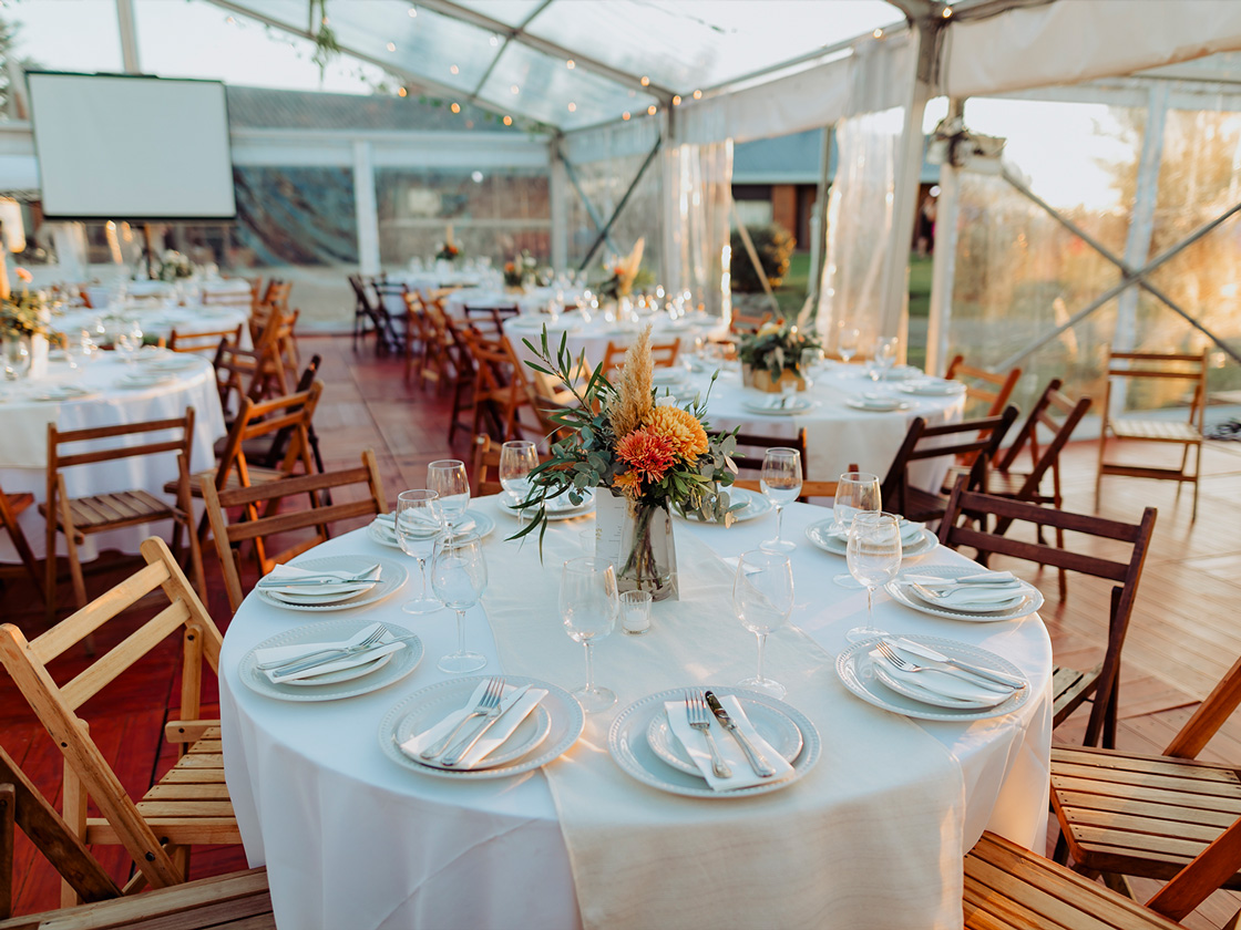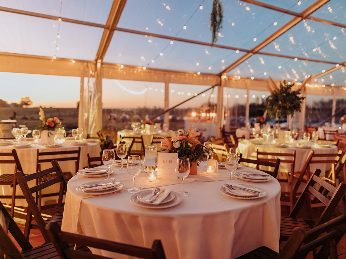 Con dos de nuestras carpas estructurales transparentes, diseñamos un espacio que reflejaba su personalidad. Un piso de madera, mesas de bar y sillas cómodas, invitaron a los invitados a disfrutar de una velada inolvidable y divertida.
