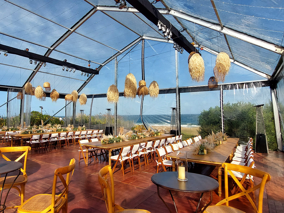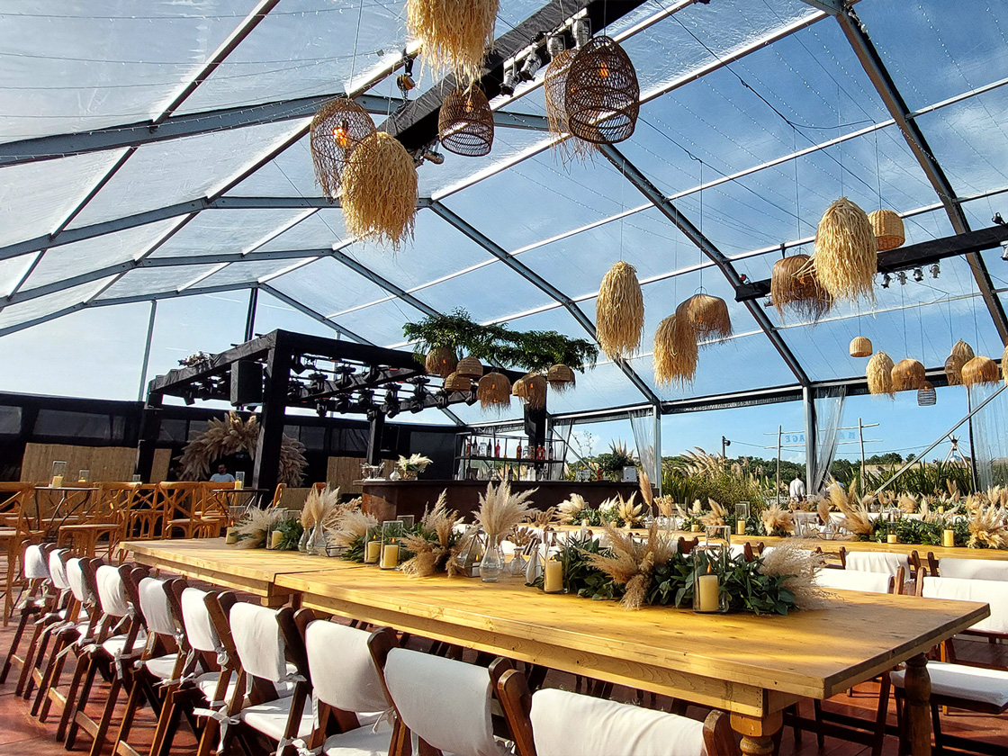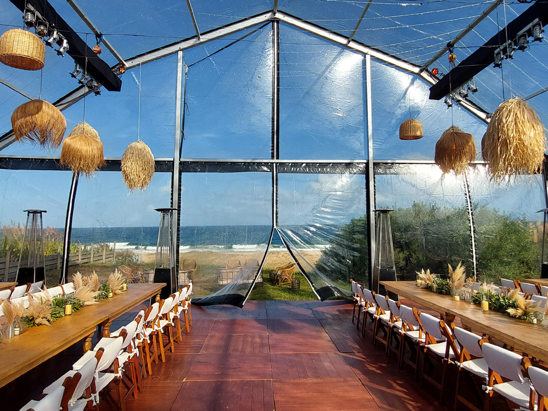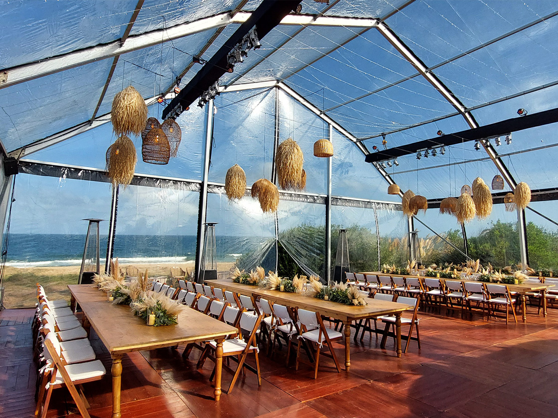 ¿Y qué mejor que hacerlo bajo las estrellas? Nuestra carpa poligonal transparente se convirtió en el escenario ideal, ofreciendo una vista panorámica del cielo mientras sus invitados danzaban al ritmo de la música. La brisa marina, las luces cálidas y el sonido de las olas crearon un ambiente único.